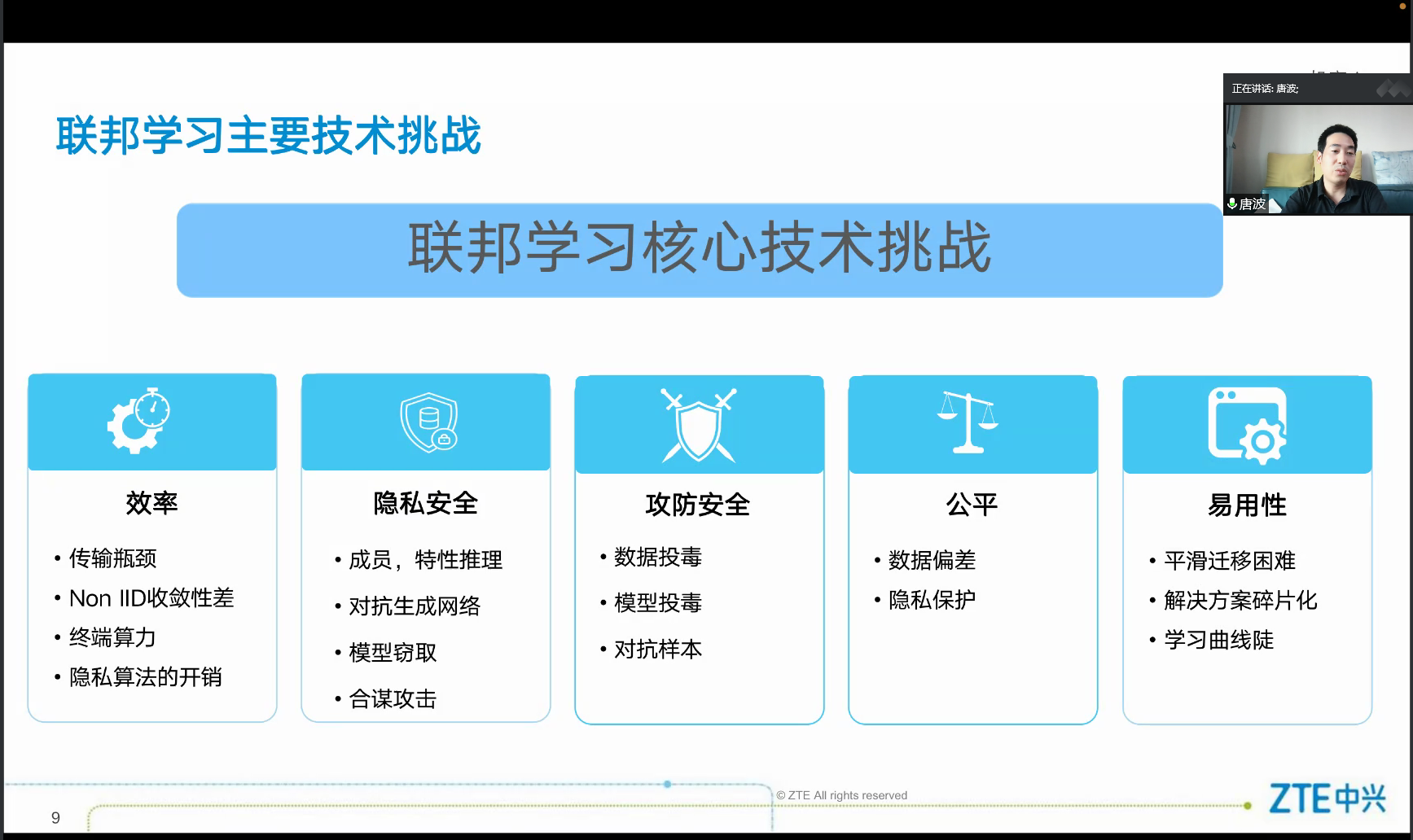 首先,报告在联邦学习背景和概念的基础上,给出联邦学习当前面临的主要问题、挑战,引出联邦学习的研究内容和方向。接着,报告给出联邦学习主要面临的安全威胁以及应对策略;差分隐私、秘密共享等隐私计算算法的基本原理以及在联邦学习中的应用;解决联邦学习性能和效率问题的相关算法,包含聚合优化算法、数据压缩算法等。最后,报告简要介绍中兴在联邦学习领域的实践以及开源项目情况。报告吸引了众多师生参与,多名同学和唐波先生进行了问题探讨。
