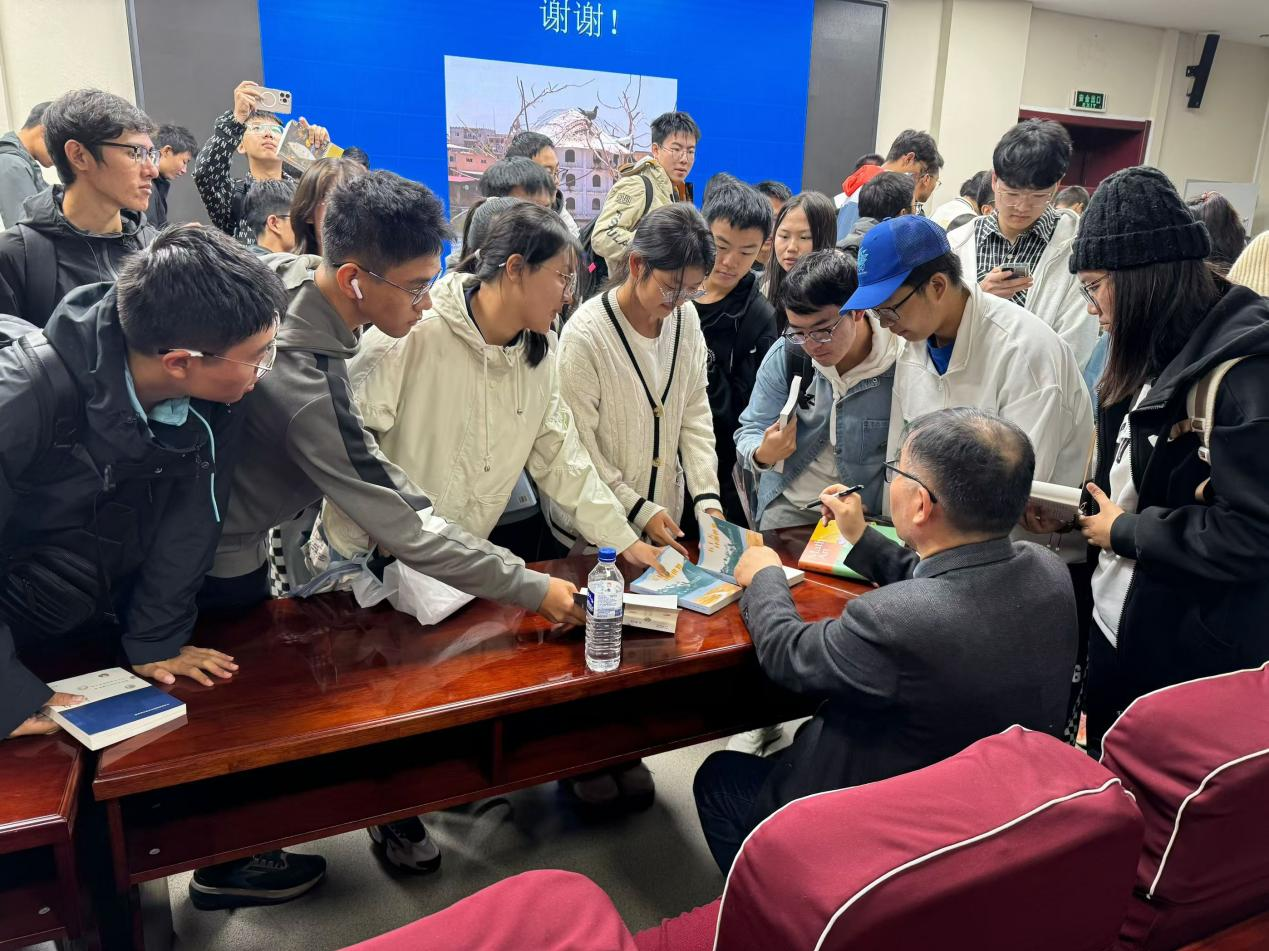 讲座结束后,蔡天新教授热情回答了同学欧洲足球比赛旅行如何对数学和文学产生启发的提问。他深刻地阐述了旅行如何拓宽视野、激发灵感,以及如何通过旅行来丰富自己的人生体验。最后,蔡教授向同学们赠送了自己的签名书籍,鼓励大家勇敢探索未知的世界,追求自己的梦想。