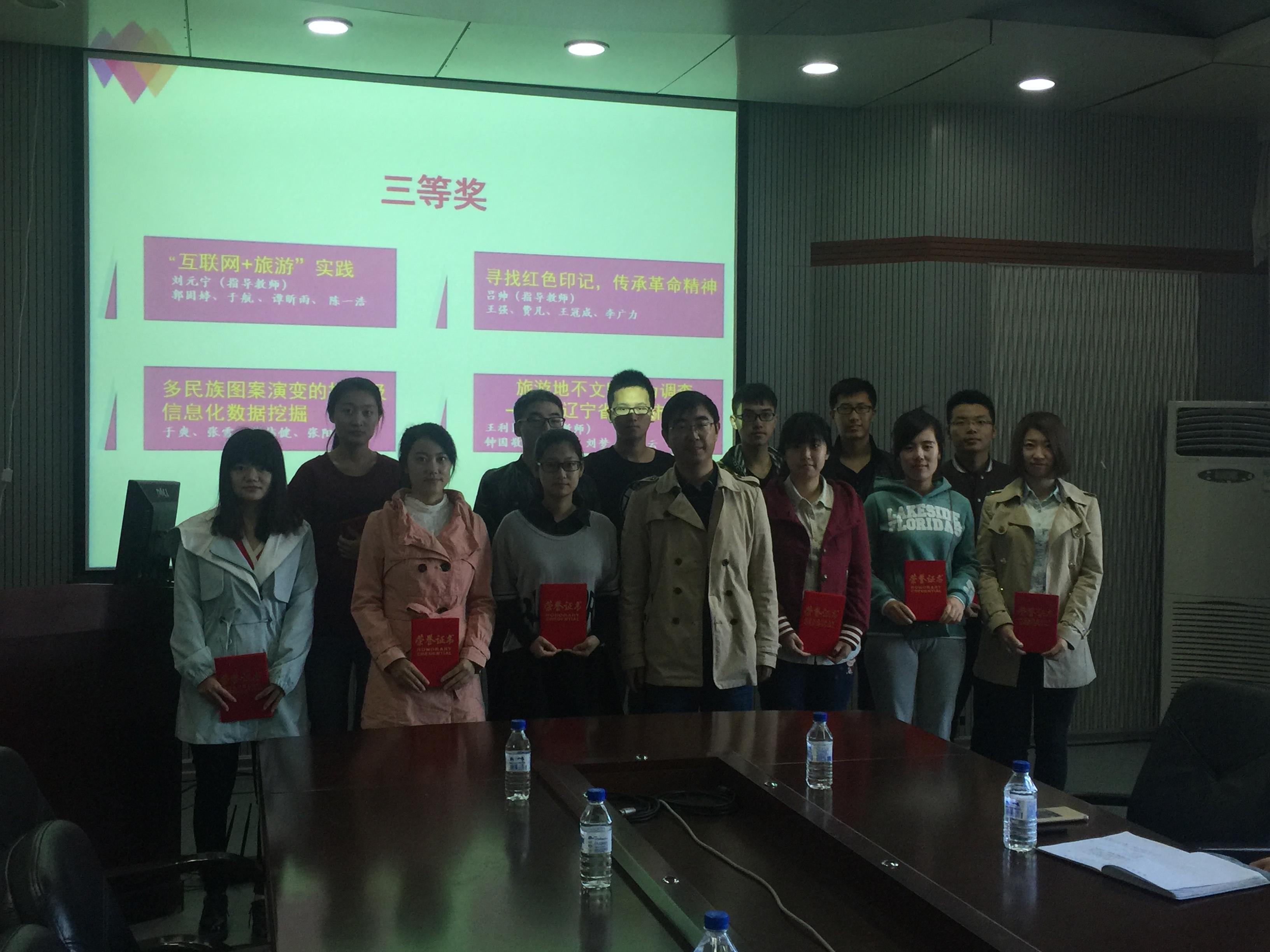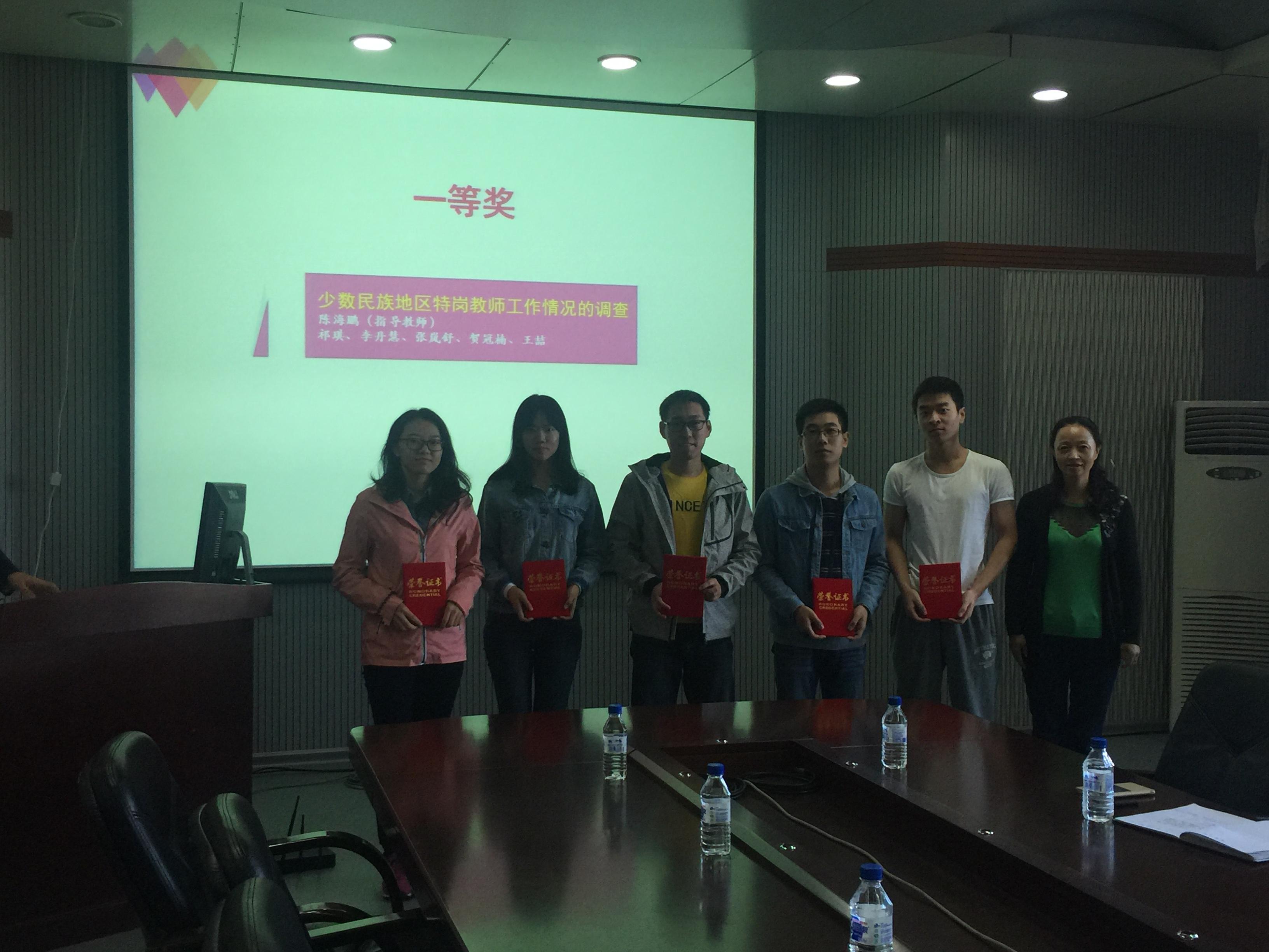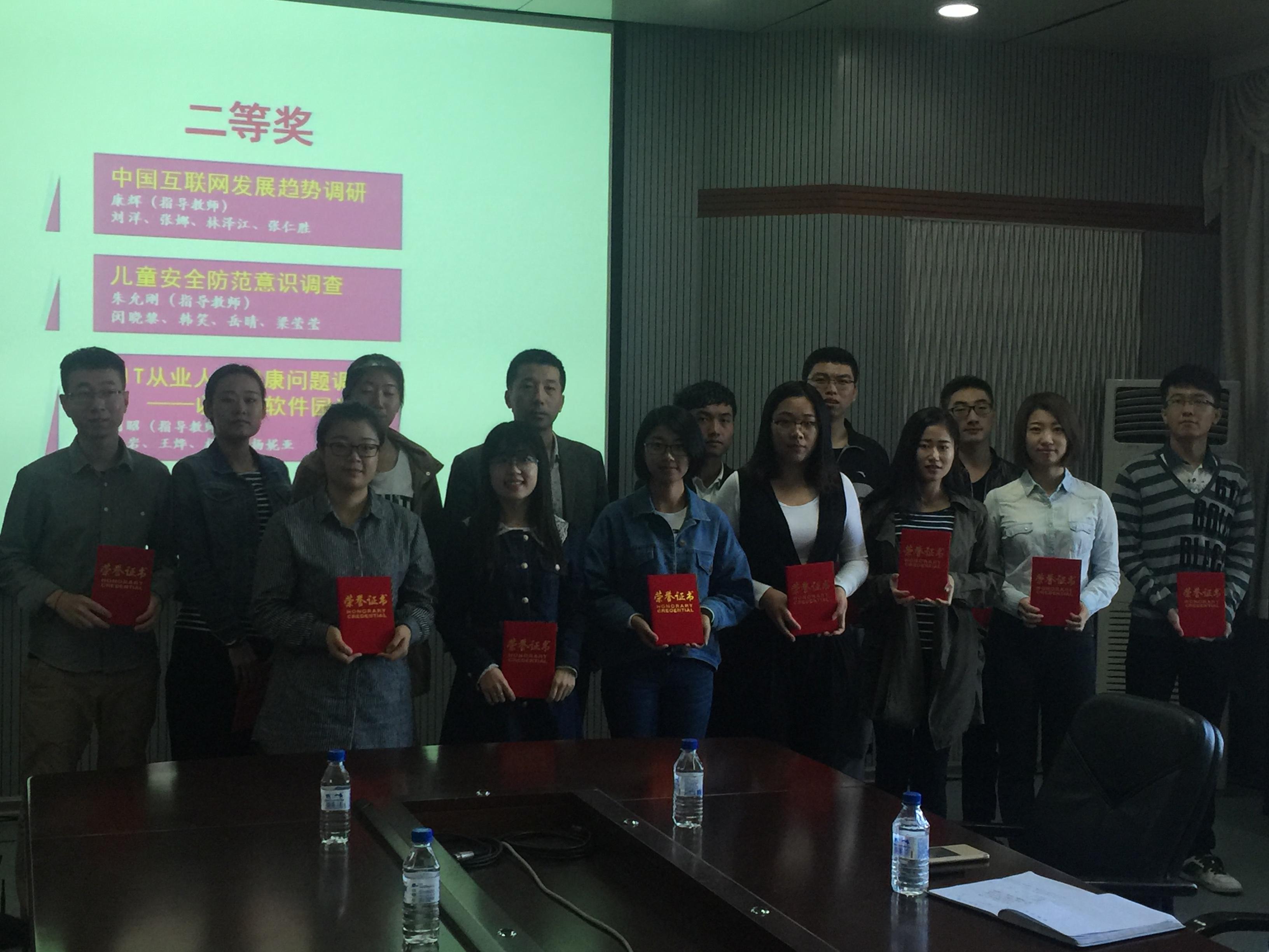 支持力度大,调研主题涵盖广,成果收获足等。接下来由张霁雪老师为“互联网+旅游”实践团队,多民族图案演变的搜集及信息化数据挖掘团队、旅游地不文明行为调查团队颁发三等奖证书。杜天宝老师为中国互联网发展趋势调研团队、儿童安全防范意识调查团队、IT从业人员健康问题调研团队颁发二等奖获奖证书。郑爽老师为少数民族地区特岗教师工作情况调查团队颁发了一等奖获奖证书。颁奖过后,三支优秀队伍对本次暑期社会实践内容作了经验分享。